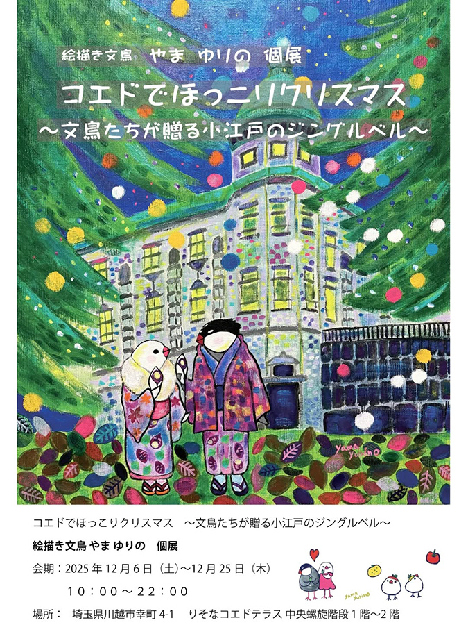 絵描き文鳥 やま ゆりの 個展 コエドでほっこりクリスマス 〜文鳥たちが贈る小江戸のジングルベル〜 2025年12月9日 開催期間 2025年12月6日(土)〜25日(木) 営業時間 10:00〜22:00 開催場所 りそなコエドテラス(中央螺旋階段 1階〜2階) 埼玉県川越市幸町4-1 https://www.saitamaresona.co.jp/labtama/koedo-terrace/ 本川越駅(西武新宿線) 徒歩 約 12〜14分 川越駅(東武東上線/JR川越線) 徒歩 約 23〜26分 川越駅/本川越駅からバスあり 「一番街」バス停 下車 徒歩すぐ